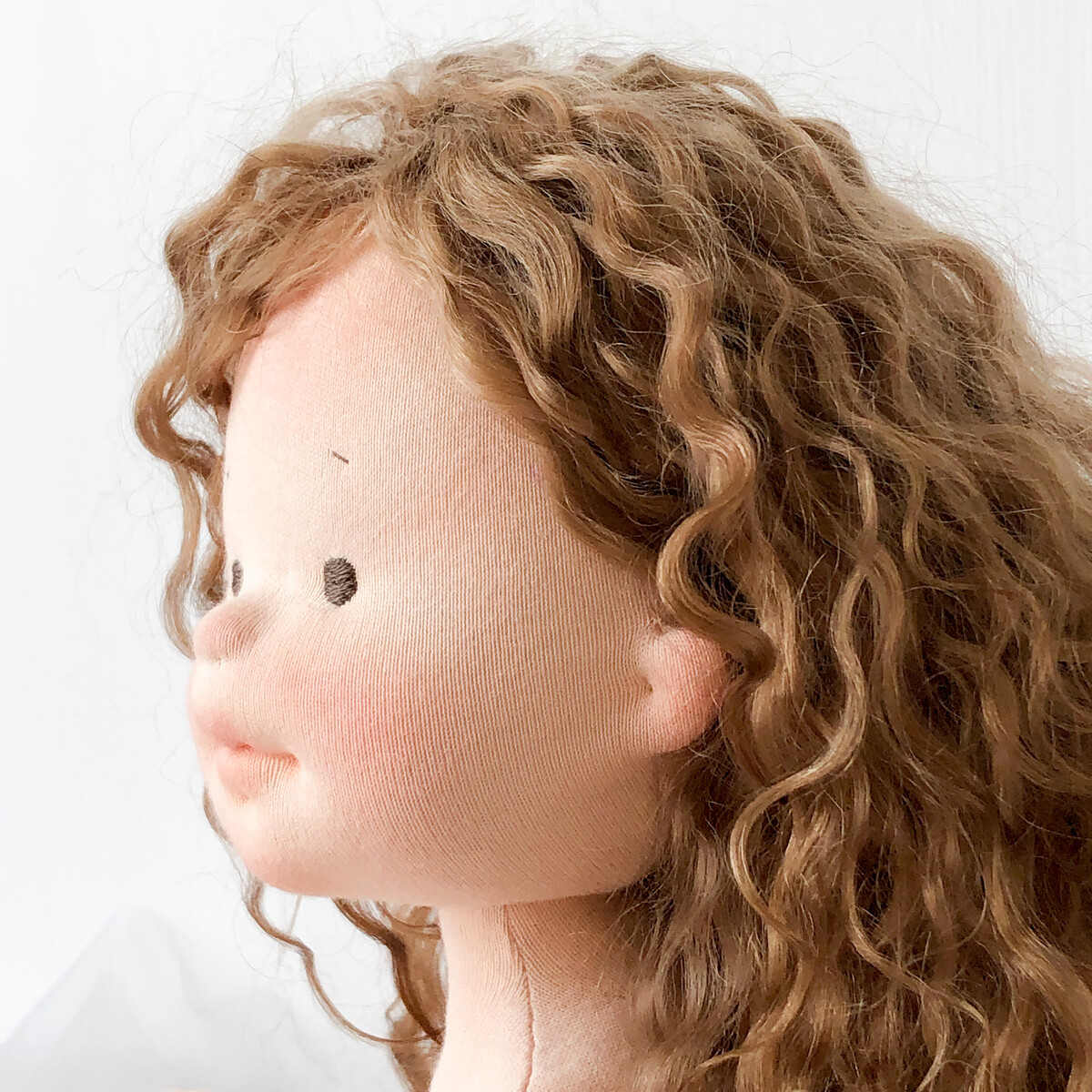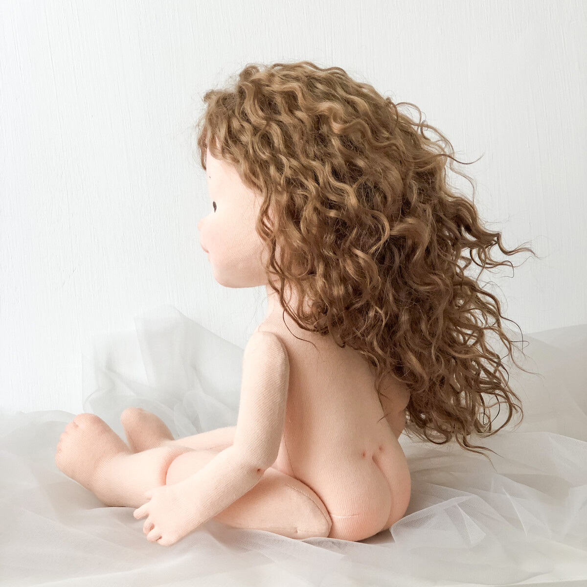 У Таси волшебные волосы из нежнейшей окрашенной шерсти ангорских козочек. Специально для этого курса разработан необычный, интересный способ изготовления паричка и крепления волос. Прическа получается очень надежная, волосы густые, не лезут, не выпадают, выдерживают даже тщательное расчесывание, при этом на поверхности головы не видно никаких ниток, вязаных рядов и т.п