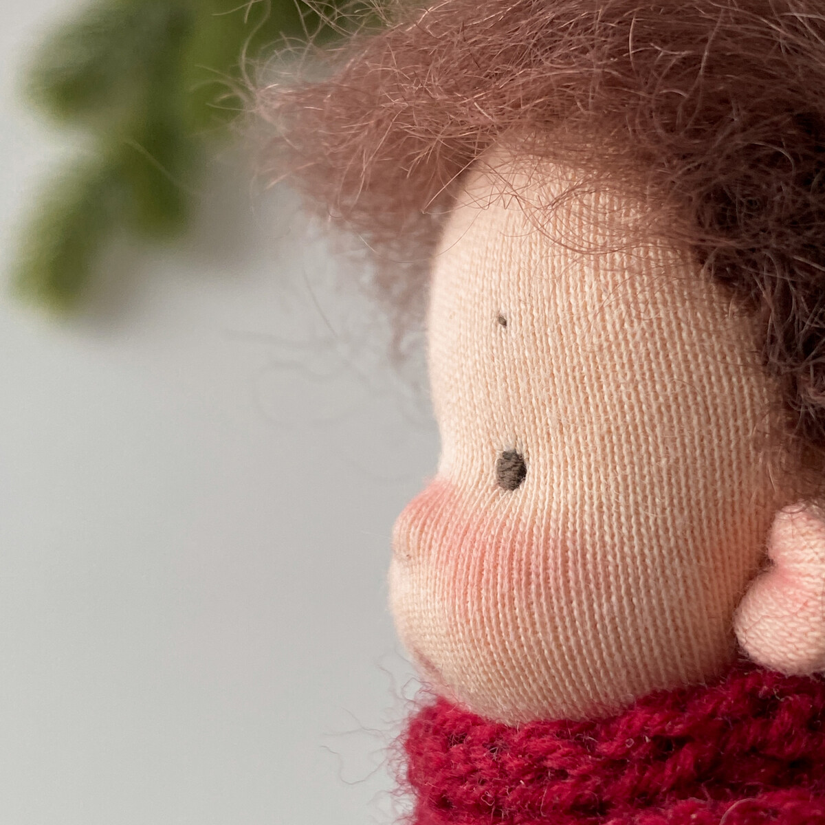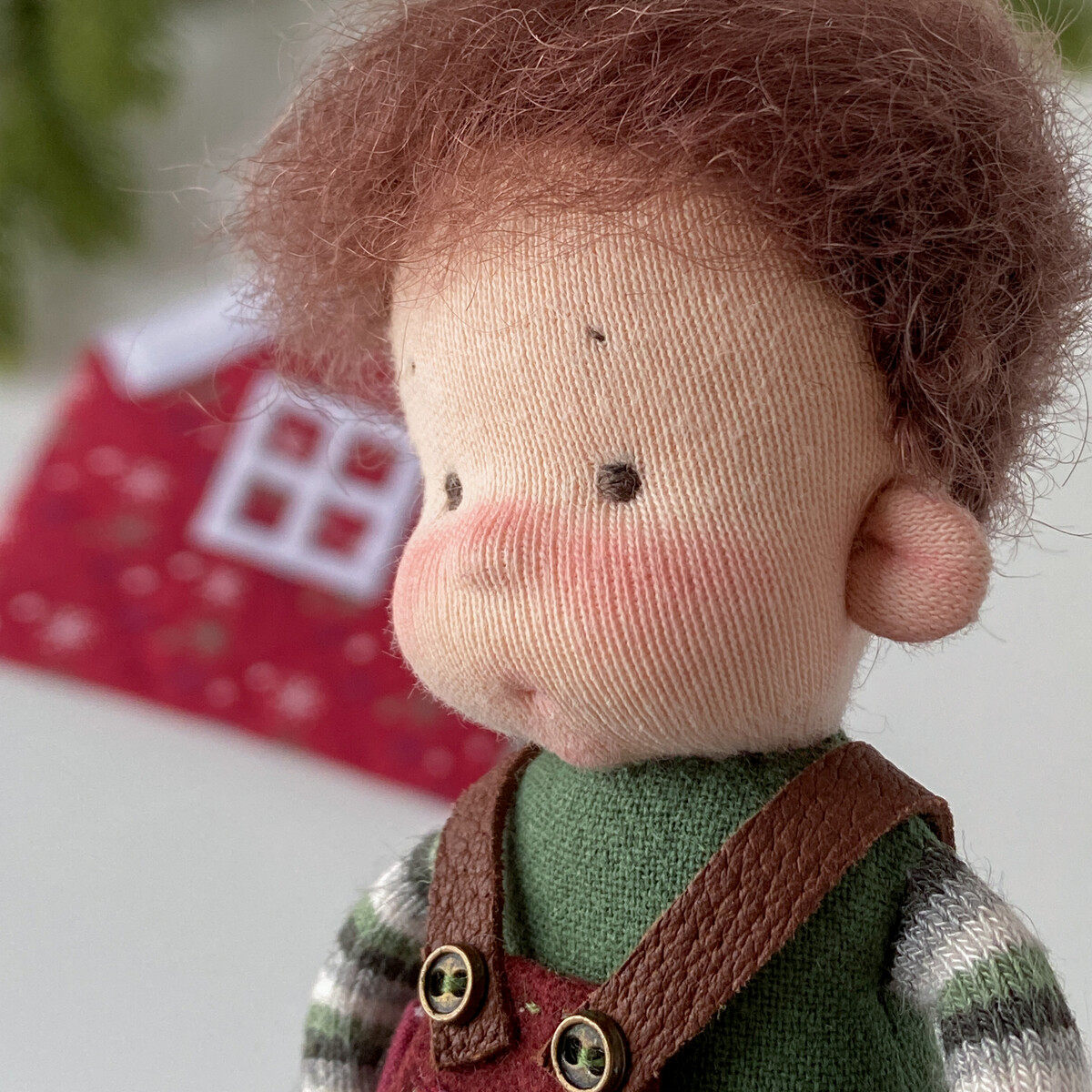 Куколка, одежда, сумочка полностью текстильные. Волосы у Васи из мягкой шелковистой пряжи букле, тело и одежда из хлопка и хлопкового трикотажа